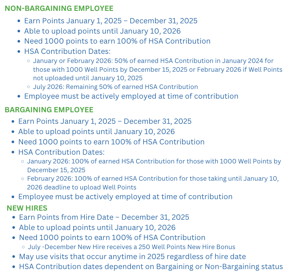 Employees who have not met the 1000 Well Points for 2025 and would like to earn the 2026 HSA Contribution are still eligible!