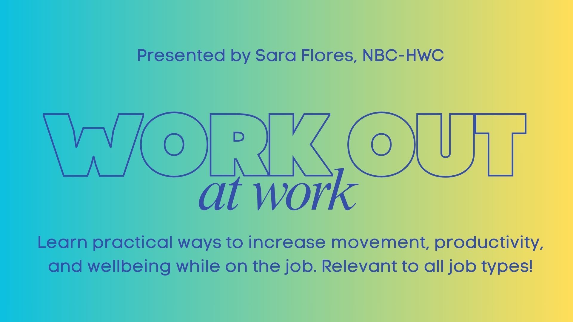 Have you ever stood up from hours of working at your desk, only to feel stiff and antsy to move your body? Or perhaps you spend a lot of time on your feet but struggle with specific aches and pains? Come learn how small movement breaks throughout your work day can have a positive impact on your ability to focus, your mood, and your overall wellbeing. Even 1-minute increments throughout your day are enough to start making a difference!
