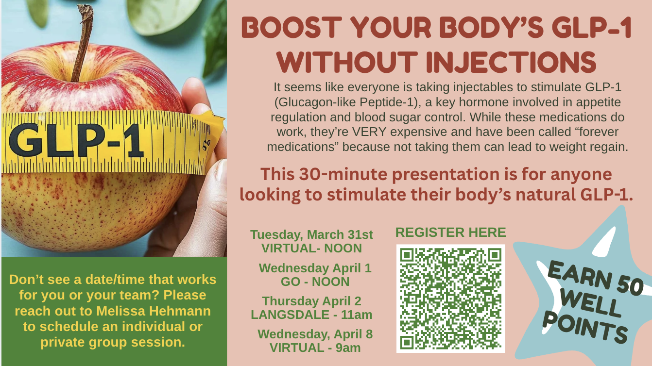 It seems like everyone is taking injectables to stimulate GLP-1 (Glucagon-like Peptide-1), a key hormone involved in appetite regulation and blood sugar control. While these medications do work, they’re VERY expensive and have been called “forever medications” because not taking them can lead to weight regain. In this 30-minute workshop, you'll learn ways to boost your body's natural GLP-1. This workshop is appropriate for: